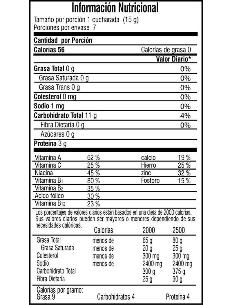 Mezcla vegetal balanceada de arroz y soya, con adición de Quinua, vitaminas A, B1, B2 y minerales como Hierro, Calcio y Zinc. Alimento rico en proteínas, su aminograma cumple en un 100% las recomendaciones de la F.A.O Ideal para la alimentación infantil, hipertensos, diabéticos y personas de la tercera edad